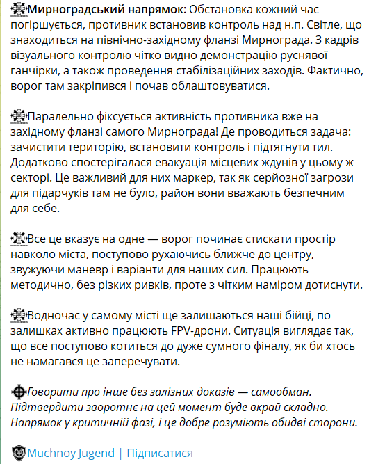 "Ситуація з кожною годиною погіршується, противник встановив контроль над населеним пунктом Світле, розташованим на північно-західному фланзі Мирнограда. На кадрах візуального контролю чітко видно демонстрацію російського триколору, а також проведення стабілізаційних заходів. Фактично ворог там закріпився і почав облаштовуватися. Паралельно фіксується активність противника на західному фланзі самого Мирнограда. Там проводиться завдання: зачистити територію, встановити контроль та підтягнути тил. Додатково спостерігалася евакуація місцевих мешканців у цьому ж секторі", - пише боєць ЗСУ.