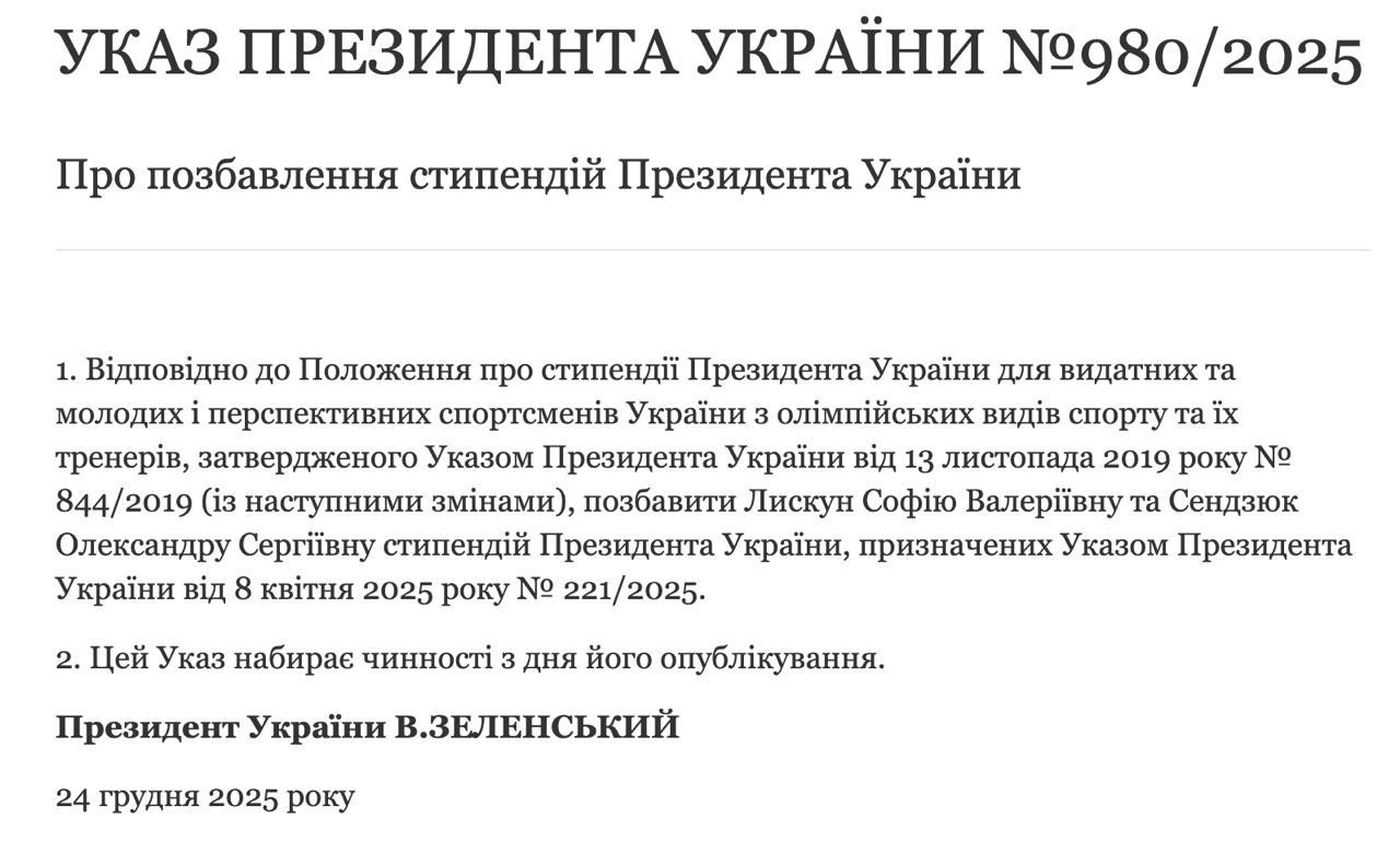 Президент України Володимир Зеленський позбавив президентських стипендій чемпіонку Європи зі стрибків у воду Софію Лискун, яка прийняла російське громадянство, а також її тренера Олександру Сендзюк.