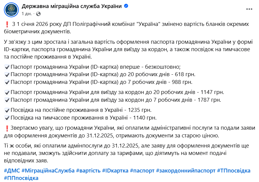 У відомстві уточнили, що громадяни, які сплатили адмінпослуги та подали заяви до 31 грудня 2025 року, отримають документи за старими цінами.
