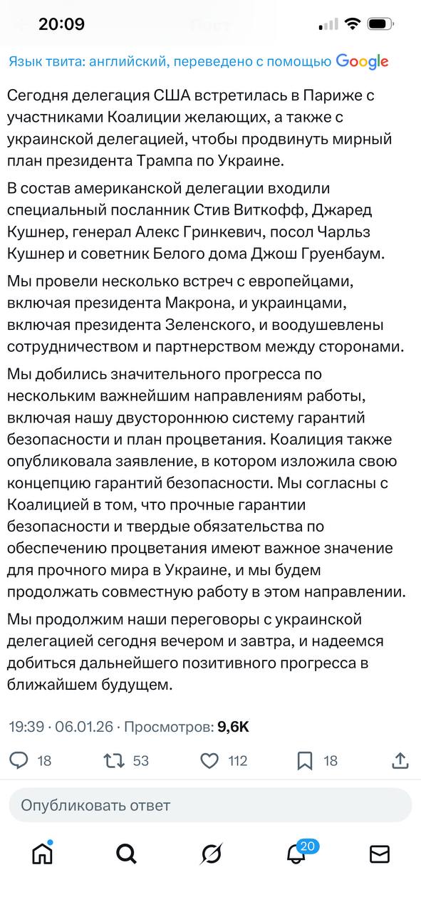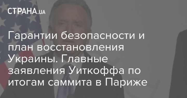 Спецпосланець Білого дому Стівен Уіткофф заявив про "значний прогрес" за декількома напрямками роботи, включаючи рамкову програму гарантій безпеки та план розвитку України за підсумками зустрічі "коаліції охочих" у Парижі.