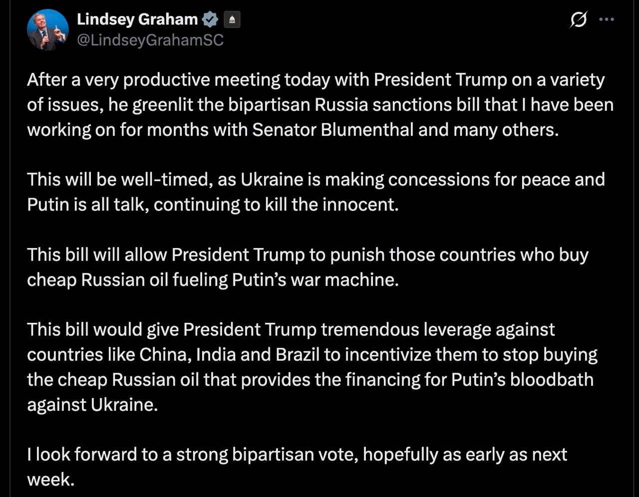 Грем заявив, що ініціатива дасть Трампу "величезні важелі тиску" на такі країни як Китай, Індія та Бразилія, щоб спонукати їх відмовитися від закупівель російської нафти. Він розраховує на двопартійне голосування та припускає, що воно може відбутися вже наступного тижня.