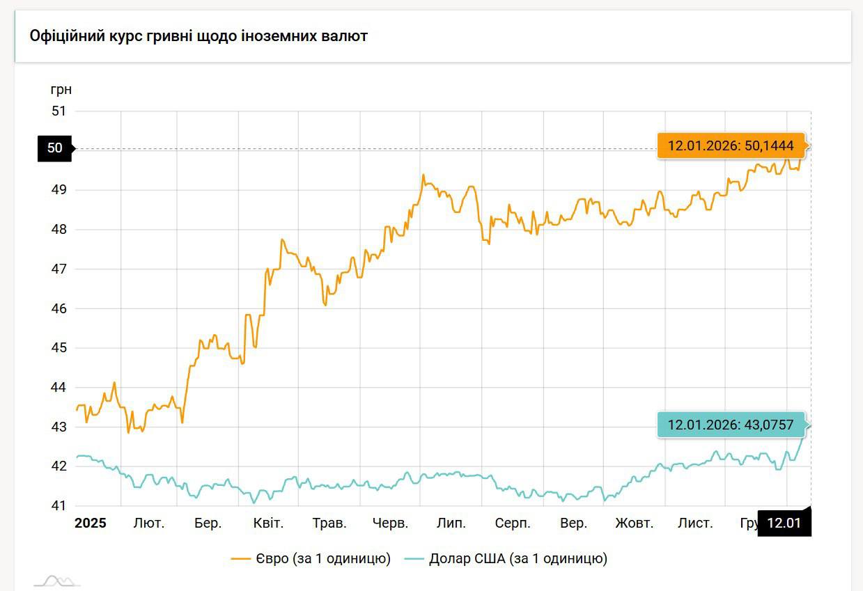 Нацбанк продовжує девальвувати гривню. Сьогодні закріпився тренд на її зниження до долара і НБУ вперше в історії встановив свій офіційний курс вище за нову психологічну позначку в 43 грн/$— а саме, на 43,0757 грн/$на 12 січня 2026 року.