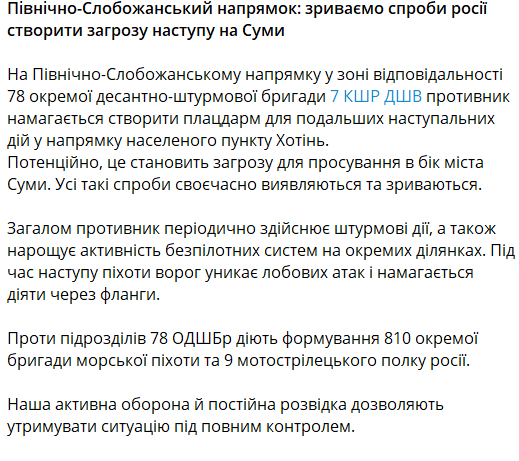 За оцінкою військових, наступ зараз ведеться у напрямку селища Хотень, що у перспективі створює небезпеку наступу безпосередньо на Суми.