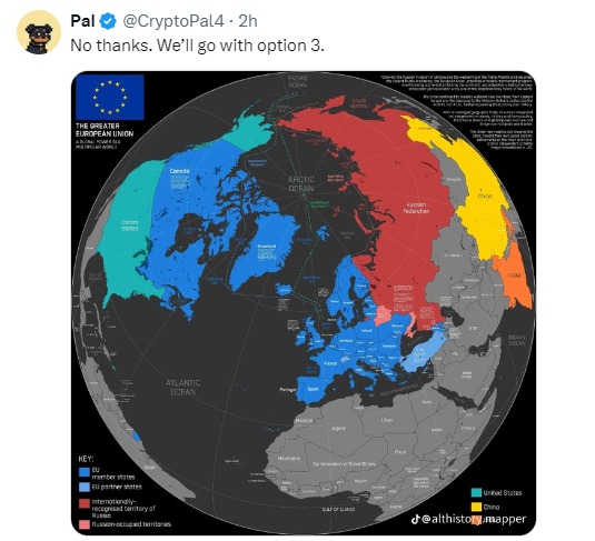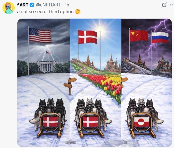 В офіційному акаунті Білого дому в соцетях з'явилося зображення собачої упряжки, перед якою відкриваються два шляхи: у бік Вашингтона та у бік Пекіна та Москви. Зображення супроводжується підписом: "Куди підете, гренландці?"