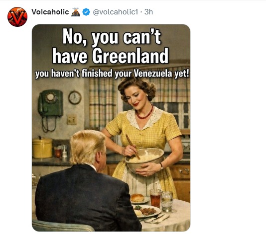 На другому Дональді Трампу, який сидить за обіднім столом, жінка накладає їжу зі словами: "Ні, ти не можеш отримати Гренландію - ти ще не закінчив з Венесуелою".
