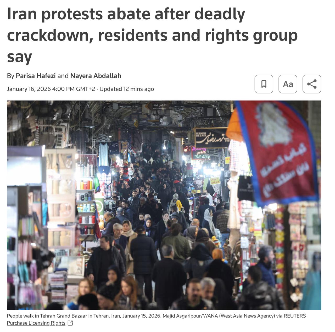 Декілька жителів Тегерана заявили, що в столиці ще з неділі панує спокій. Вони сказали, що над містом літають дрони, хоча у четвер та п'ятницю вони не бачили жодних ознак протестів.