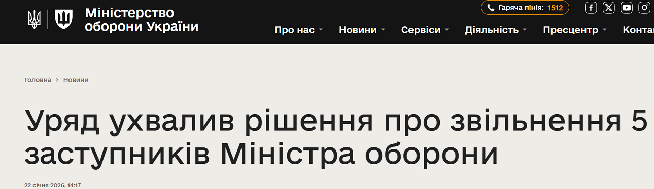 Кабінет міністрів України ухвалив рішення про звільнення п'яти заступників міністра оборони Михайла Федорова.