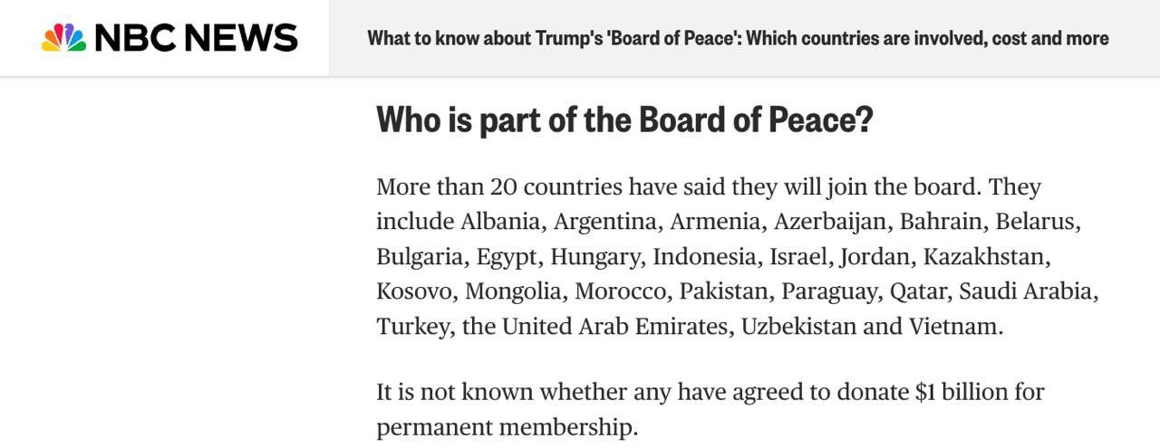 Телеканал NBC News у сьогоднішній статті повідомив, що згоду увійти до ради крім США, дали 24 країни: Албанія, Аргентина, Вірменія, Азербайджан, Бахрейн, Білорусь, Болгарія, Єгипет, Угорщина, Індонезія, Ізраїль, Йорданія, Казахстан, Косово, Монголія, Марокко, Пакистан, Параг, Об'єднані Арабські Емірати, Узбекистан та В'єтнам.