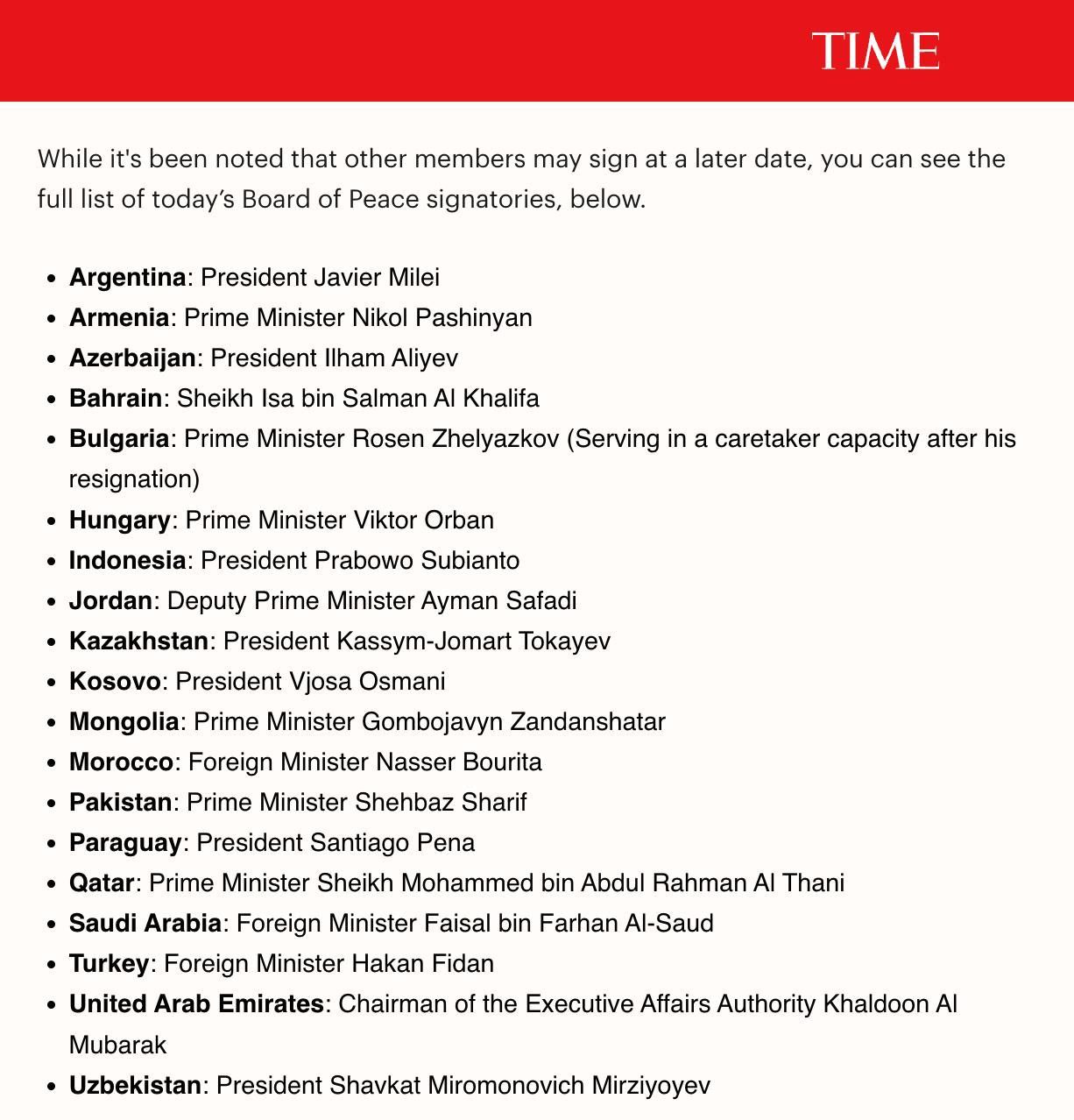 А журнал Time, як і більшість інших ЗМІ, зазначив, що статут ради вчора у Давосі підписали 19 країн. Зі списку британського видання випали Албанія, Білорусь, В'єтнам, Ізраїль та Єгипет.