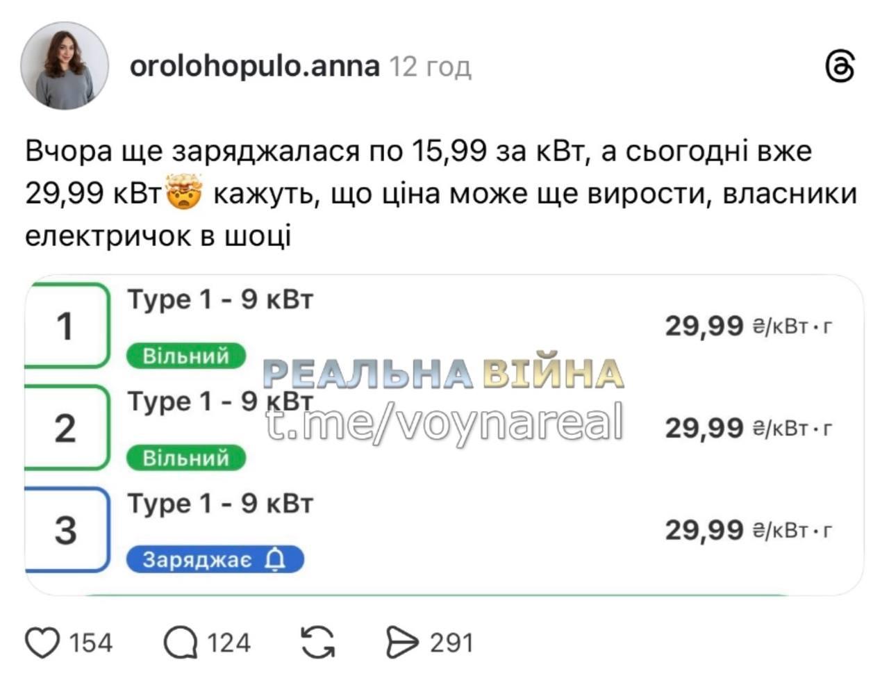 "Відкриваю сьогодні додаток, щоб подивитися, де є зарядка, і бачу, що замість тарифу 15 гривень за кіловат, за яким я заряджалася буквально вчора на тій же зарядці, тариф вже 30 гривень. І обіцяють, що до кінця тижня він буде 50. Сподіваюся, що це неправда", - написала молода жінка Ганна.