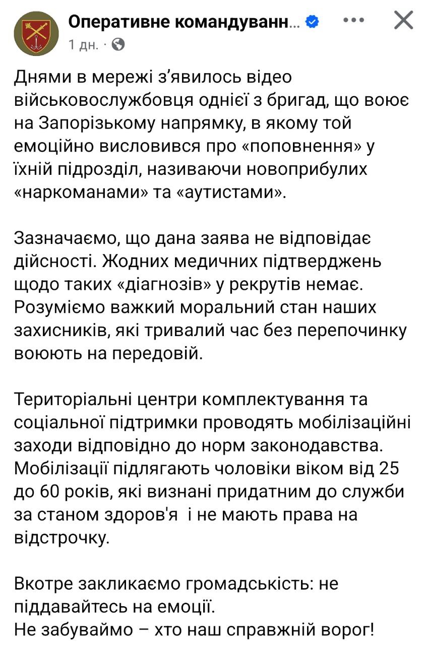 Український військовий заявив, що ТЦК відправляють на фронт під Запоріжжям аутистів та наркоманів. У ЗСУ заперечують