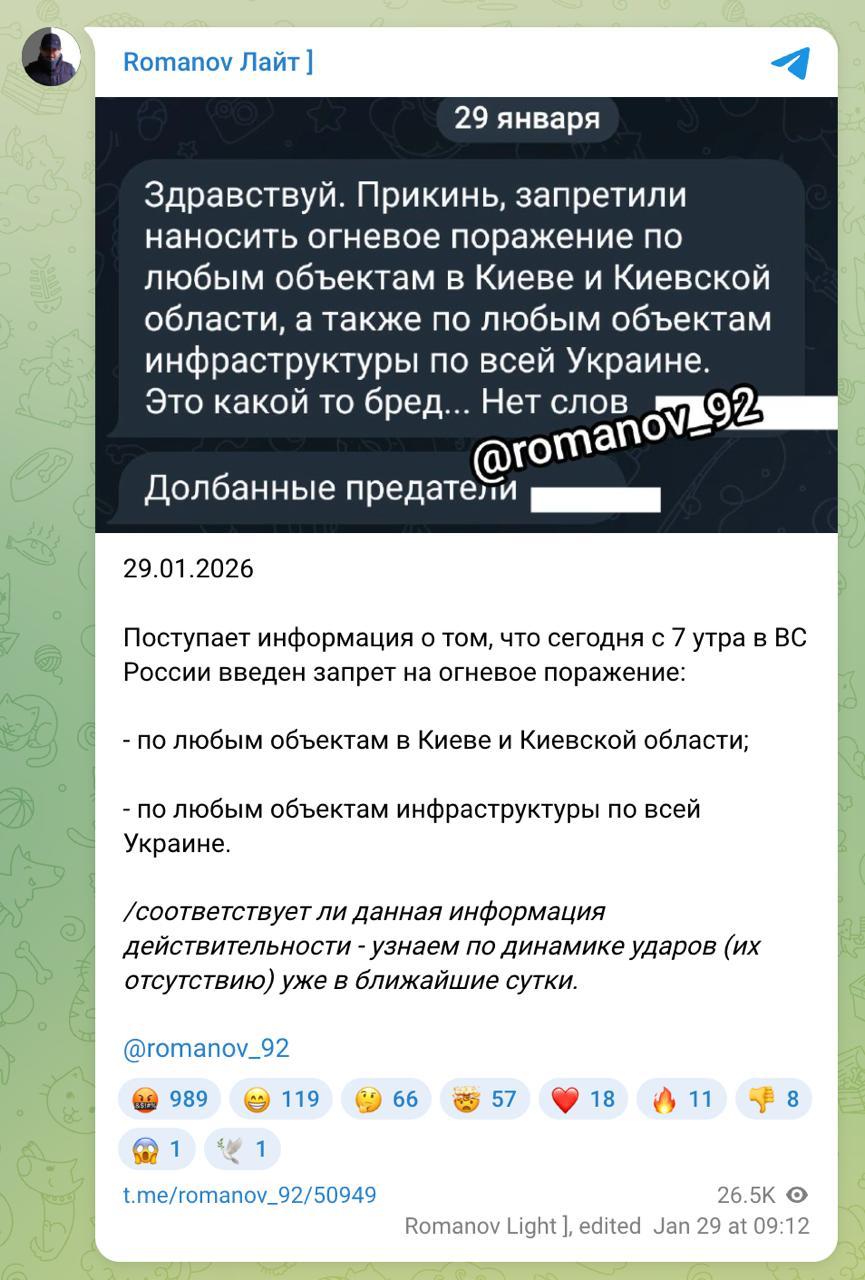 "Надходить інформація про те, що сьогодні з 7 ранку до ЗС Росії запроваджено заборону на вогневу поразку по будь-яких об'єктах у Києві та Київській області, за будь-якими об'єктами інфраструктури по всій Україні", - сказано в його публікації.