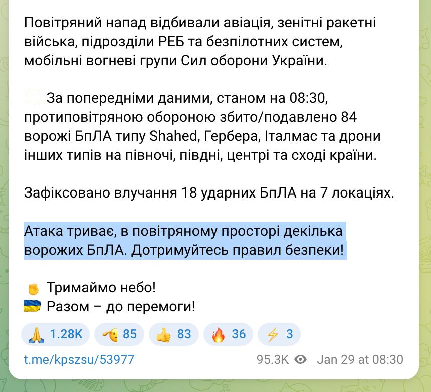 Повітряні сили ЗСУ також опосередковано спростували інформацію про енергетичне перемир'я. У їх зведенні від 8:30 про запущені та збиті цілі за минулу добу повідомляється, що "атака триває, у небі кілька ворожих БпЛА".