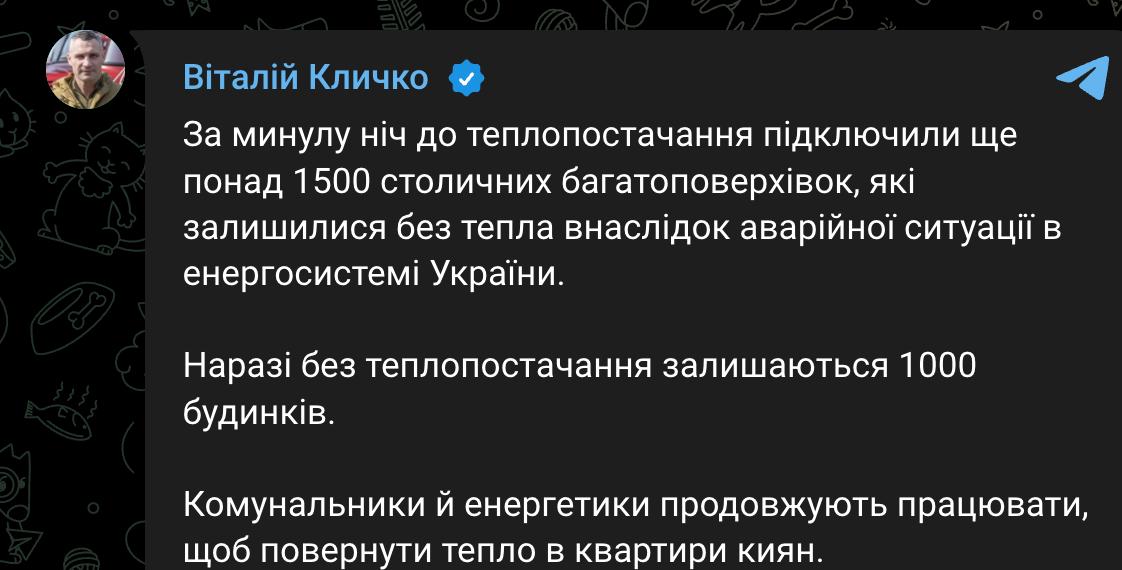 8:49 Після вчорашньої аварії в енергосистемі без тепла у Києві залишається 1000 будинків, заявив Кличко.