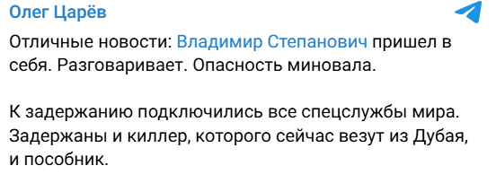 "Відмінні новини: Володимир Степанович прийшов до тями. Розмовляє. Небезпека минула", - пише Царев.