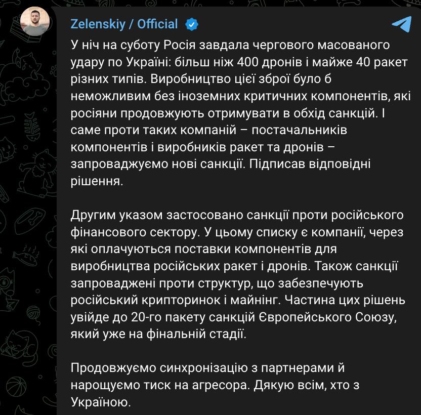"У ніч на суботу Росія завдала чергового масованого удару по Україні: більше 400 дронів і майже 40 ракет різних типів. Виробництво цієї зброї було б неможливим без іноземних критичних компонентів, які росіяни продовжують отримувати в обхід санкцій. І саме проти таких компаній - постачальників компонентів і виробників ракет і дронів - вводимо нові сан".