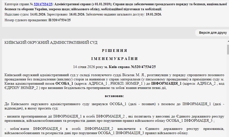 При оновленні облікових даних у "Резерві+" позивач виявив, що перебуває у розшуку за порушення правил військового обліку. Ці відомості містилися в Єдиному державному реєстрі призовників, військовозобов'язаних та резервістів. Причому чоловікові не надсилали повісток, його не притягали до відповідальності за статтями 210 чи 210-1 Кодексу України про адміністративні правопорушення. Тобто він став порушником правил військового обліку лише в електронному записі у реєстрі без належного процесуального оформлення.