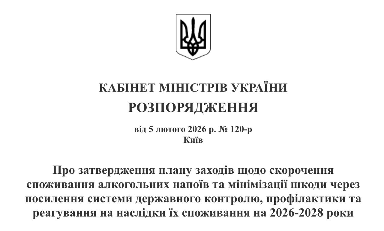 Своїм розпорядженням від 5 лютого № 120-р уряд затвердив план заходів на 2026–2028 роки, спрямованих на зменшення споживання алкогольних напоїв та мінімізацію пов'язаних із цим ризиків для здоров'я та економіки.