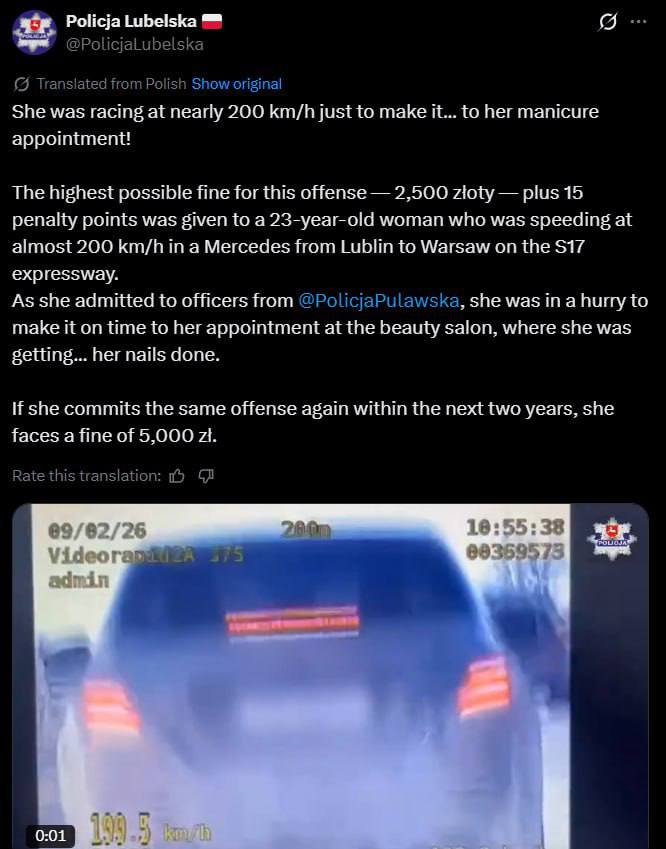 Записи з поліцейських відеореєстраторів підтвердили, що дівчина їхала на автомобілі Mercedes майже 200 км/год. при встановленому на цій ділянці дороги обмеження швидкості 120 км/год. В офіційній заяві поліції наводиться пояснення дівчини, яка заявила, що їхала зі швидкістю 200 км\год через те, що поспішала з Любліна до Варшави в салон на манікюр.