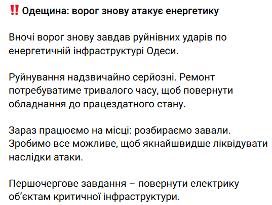 Енергетики зазначають, що першочерговим завданням є відновлення електроенергії для об'єктів критичної інфраструктури.