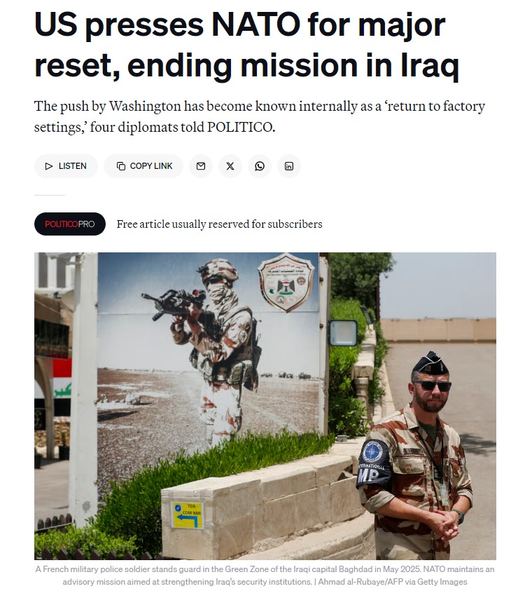Відповідно до цієї концепції Вашингтон попросив союзників вже у вересні припинити консультативну місію в Іраку, спрямовану на зміцнення іракських інститутів безпеки та створену під час першого терміну Дональда Трампа у 2018 році. США також планують вивести близько 2500 військовослужбовців із Іраку у рамках угоди з іракським урядом від 2024 року. Представник адміністрації США повідомив Politico, що це частина "прихильності Трампа до припинення нескінченних воєн".