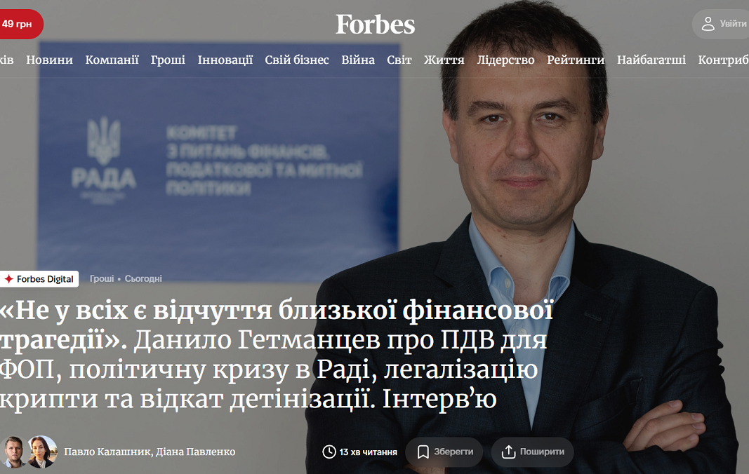 Про це в інтерв'ю українському Forbes заявив голова комітету Верховної Ради з питань фінансів, податкової та митної політики Данило Гетьманцев.