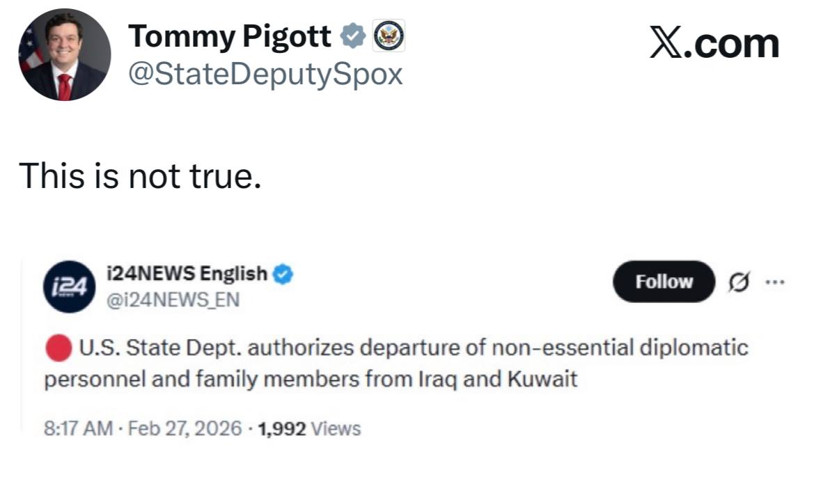 У Державному департаменті США спростували інформацію про те, що Штати санкціонували виїзд частини дипломатів та їхніх сімей з Іраку та Кувейту.
