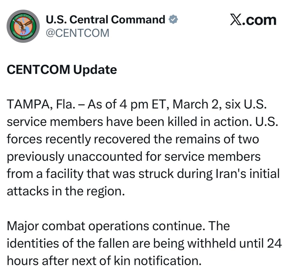 Тим часом Центральне командування Збройних сил США повідомляє, що кількість американських військовослужбовців, які загинули від ударів Ірану, зросла до шести.
