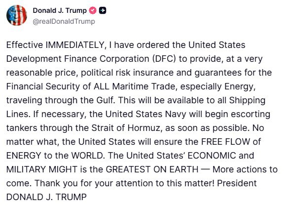 "З цього моменту я наказав Корпорації розвитку фінансів США (DFC) надавати за дуже розумною ціною страхування політичних ризиків і гарантії фінансової безпеки всієї морської торгівлі, особливо енергоресурсами, що проходить через Перську затоку. Ця підтримка буде доступна всім судноплавним лініям. При необхідності Військово-морські сили США почнуть супроводжувати танки. забезпечать вільну протоку енергії у світ. Економічна і військова міць США – найбільша на землі.