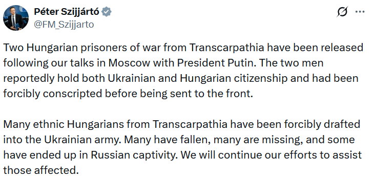 "Двоє угорських військовополонених із Закарпаття було звільнено після наших переговорів у Москві з президентом Путіним. Повідомляється, що обоє чоловіків мають як українське, так і угорське громадянство і були насильно призвані до армії перед відправкою на фронт", - написав Сійярто.
