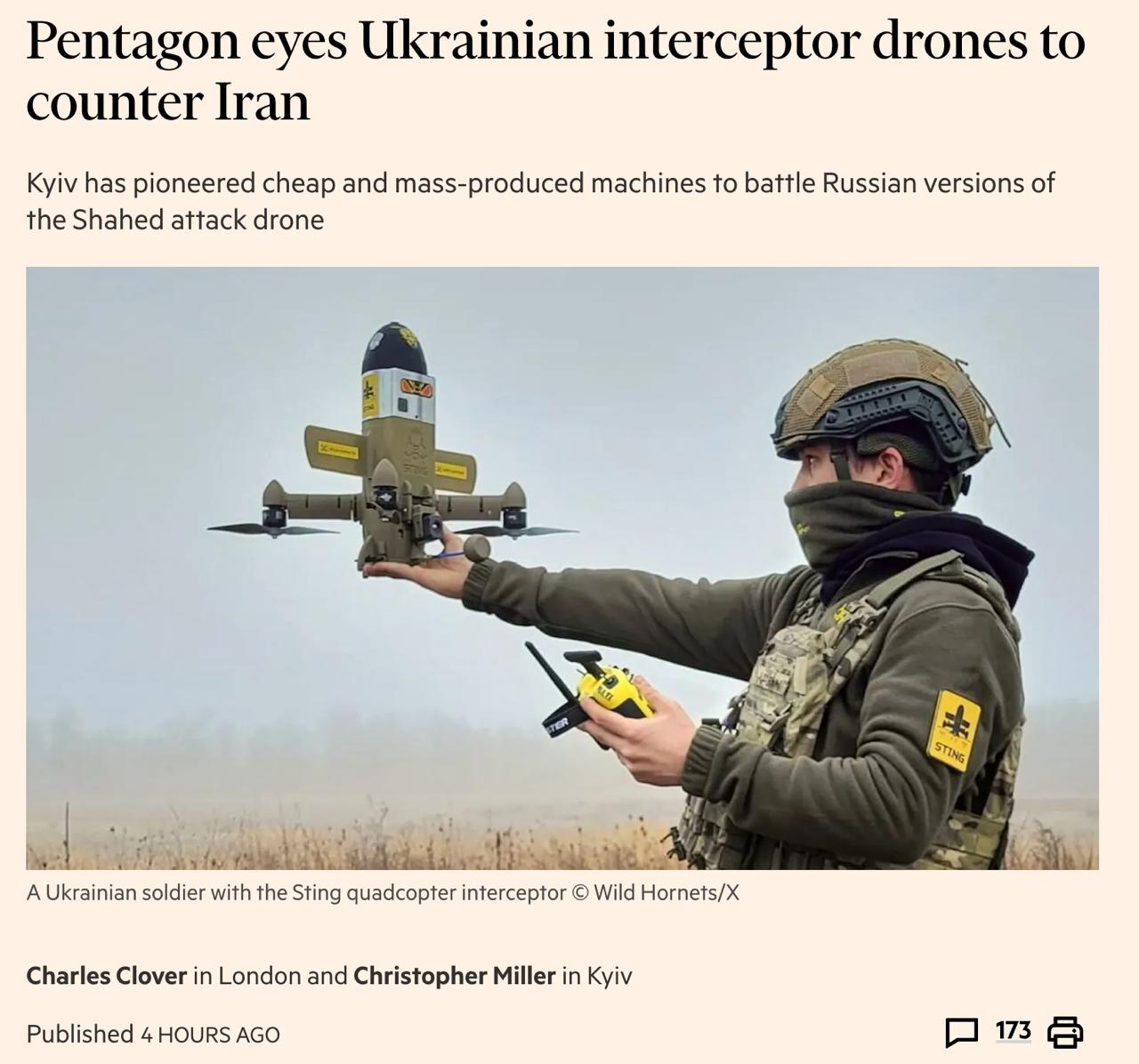 Київ стурбований власними запасами засобів боротьби з дронами, але розраховує, що якщо країни Близького Сходу використовуватимуть українські перехоплювачі замість ЗРК Patriot, то більше цих ракет дістанеться Україні для поразки російських балістичних ракет.