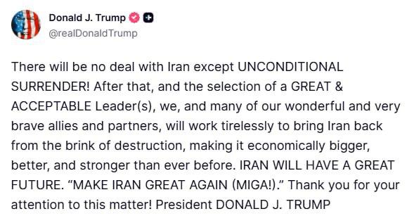 "Ніякої угоди з Іраном не буде, крім беззастережної капітуляції! Після цього і вибору великого і прийнятного лідера(ів) ми, а також багато наших чудових і дуже хоробрих союзників і партнерів будемо невпинно працювати, щоб повернути Іран з краю руйнування, зробивши його економічно більше, краще і сильніше. Зробимо Іран знову великим”, – написав президент США.